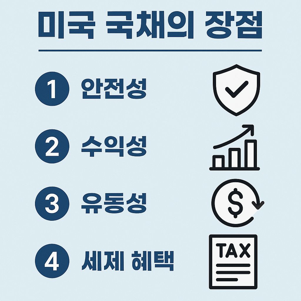 미국 국채는 미국 정부가 발행하며, 원금과 이자를 보장하는 가장 안전한 투자 수단 중 하나로 평가됩니다. 아래는 미국 국채가 가지는 주요 장점입니다: