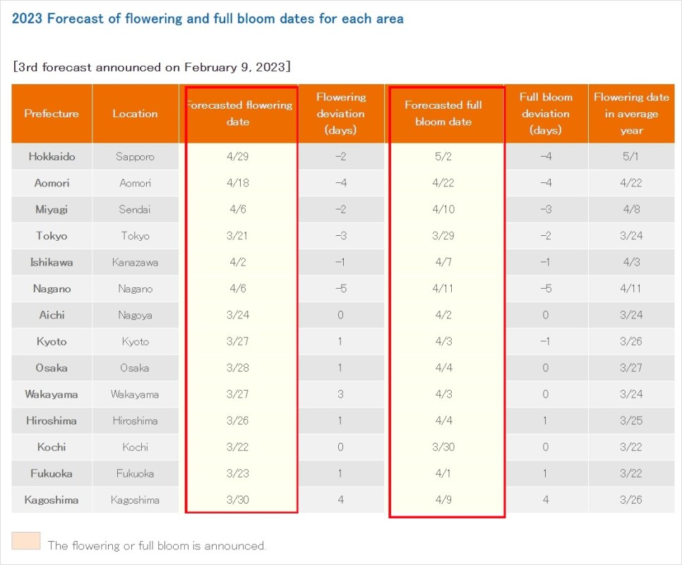 그 위로 오사카는 3월 28일, 나고야 3월 24일, 도쿄 3월 21일, 센다이 4월 6일,